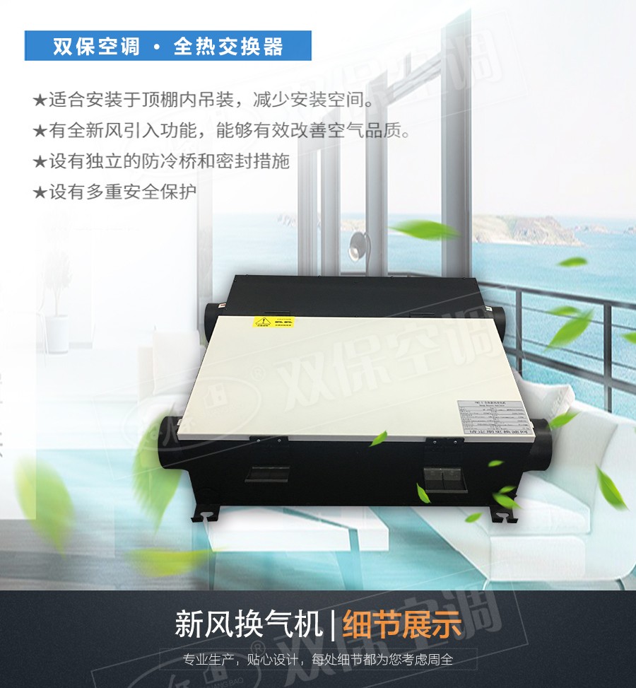 江蘇雙保空調有限公司—全熱交換器是提供新鮮空氣的一種空氣調節設備。功能上按使用環境的要求可以達到恒溫恒濕或者單純提供新鮮空氣。工作原理是在室外抽取新鮮的空氣經過除塵、除濕(或加濕)、降溫(或升溫)等處理后通過風機送到室內,在進入室內空間時替換室內原有的空氣。